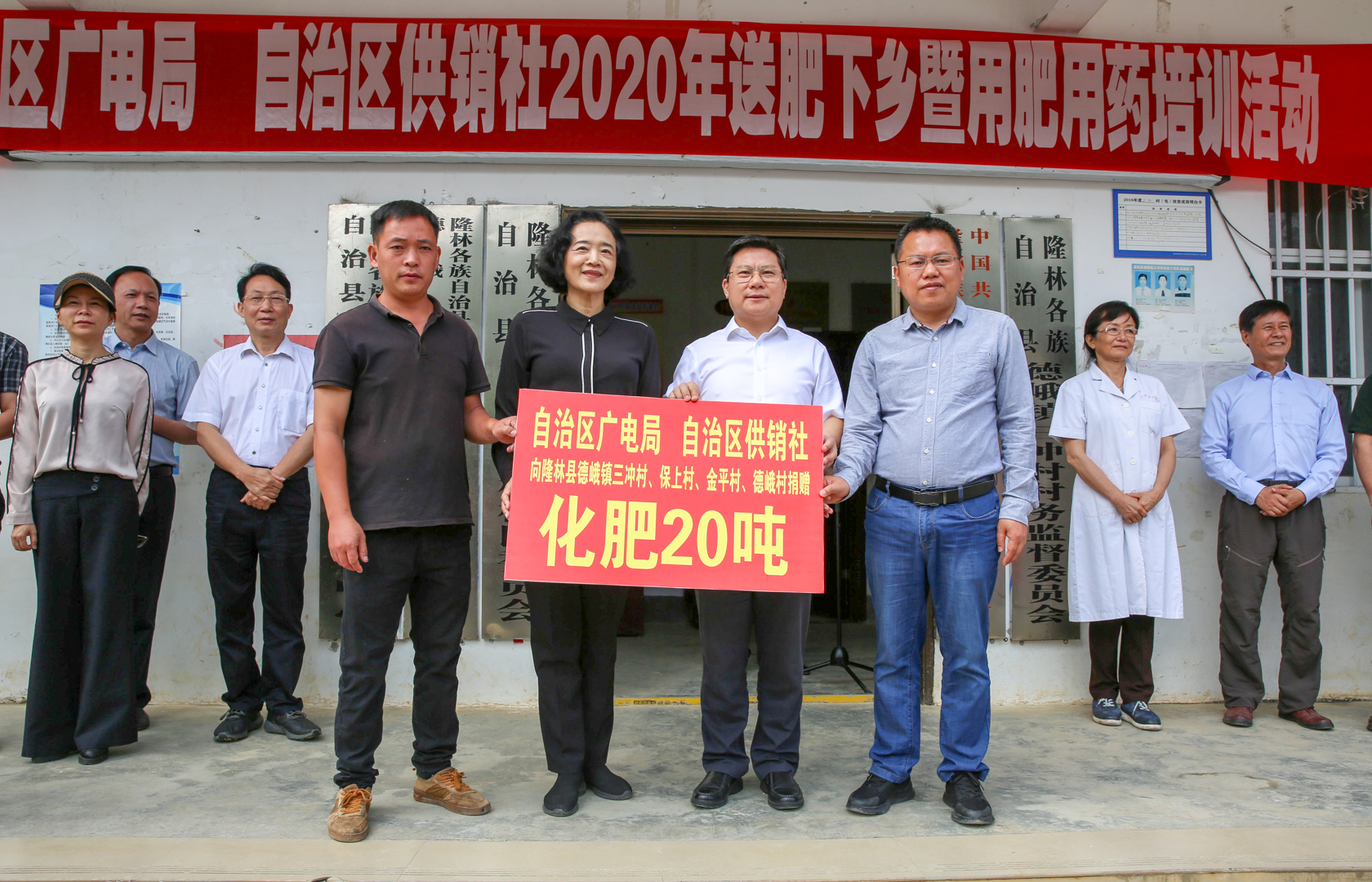 自治区广电局副局长朱为范;自治区供销社理事会副主任谭明;隆林县委、县政府领导;百色市、隆林县广电局、供销社系统有关负责同志以及隆林县德峨镇三冲村、金平村、保上村、德峨村近100名贫困群众代表参加了活动。