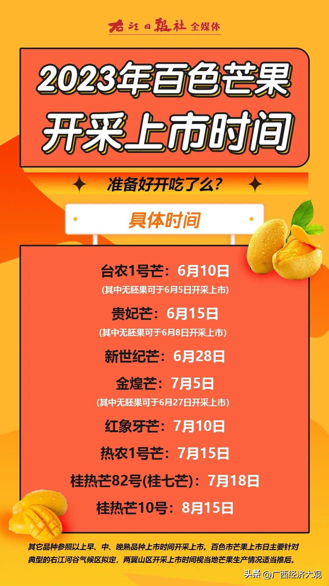 为保证百色芒果上市品质,树立和维护百色芒果品牌形象,防止未成熟芒果上市销售,根据2023年百色市气候特点、果园管理情况,结合有关专家、技术人员对百色芒果生物学特性分析,确定了2023年百色芒果主要品种开采上市日。