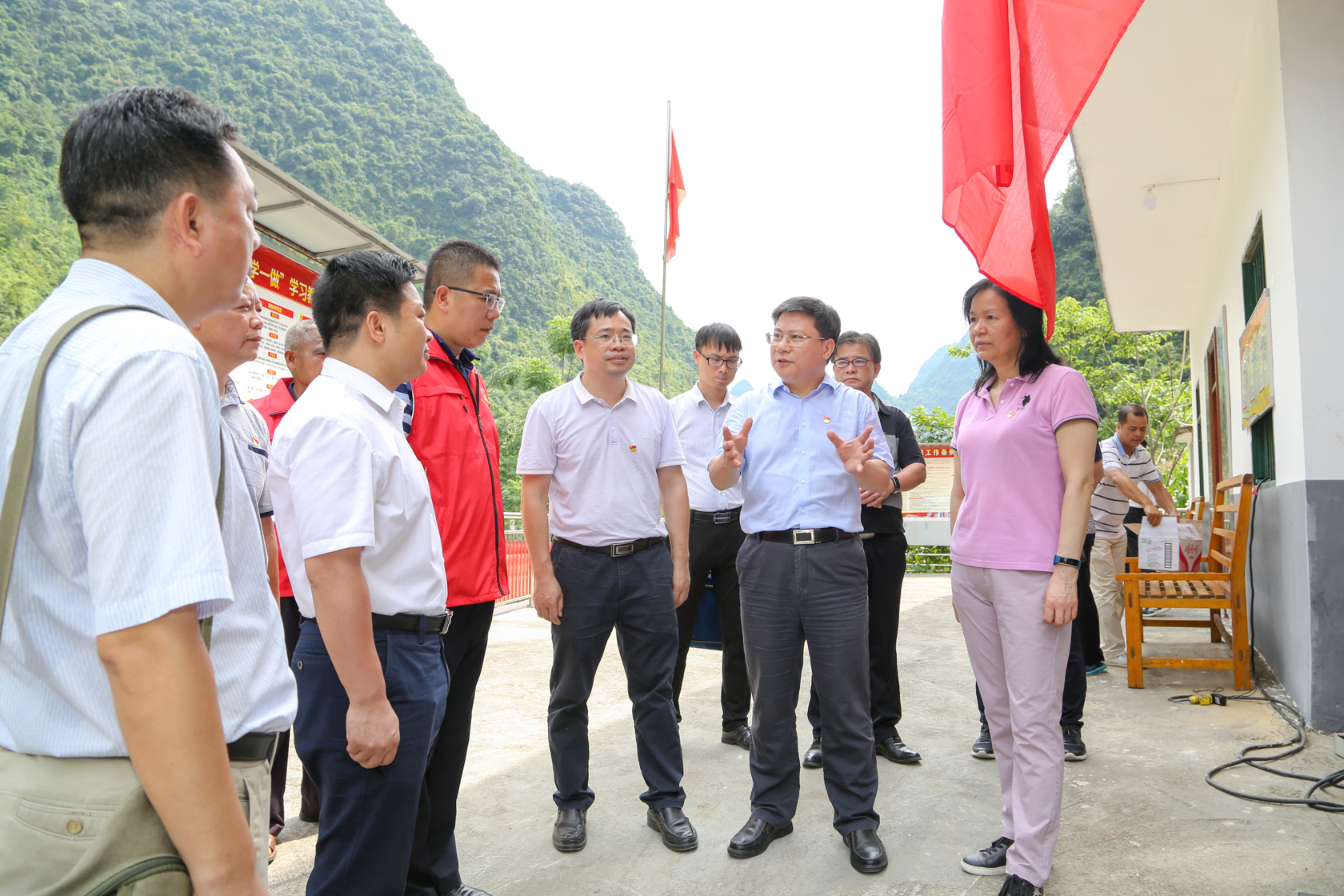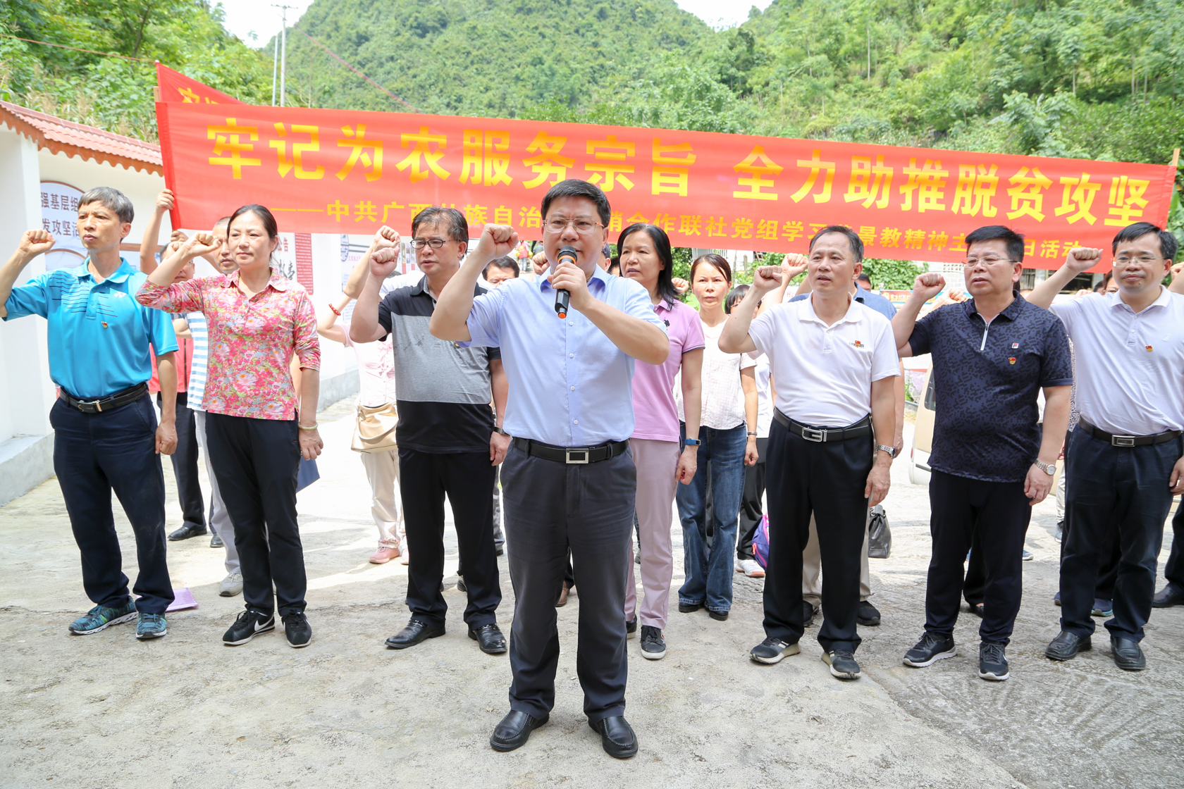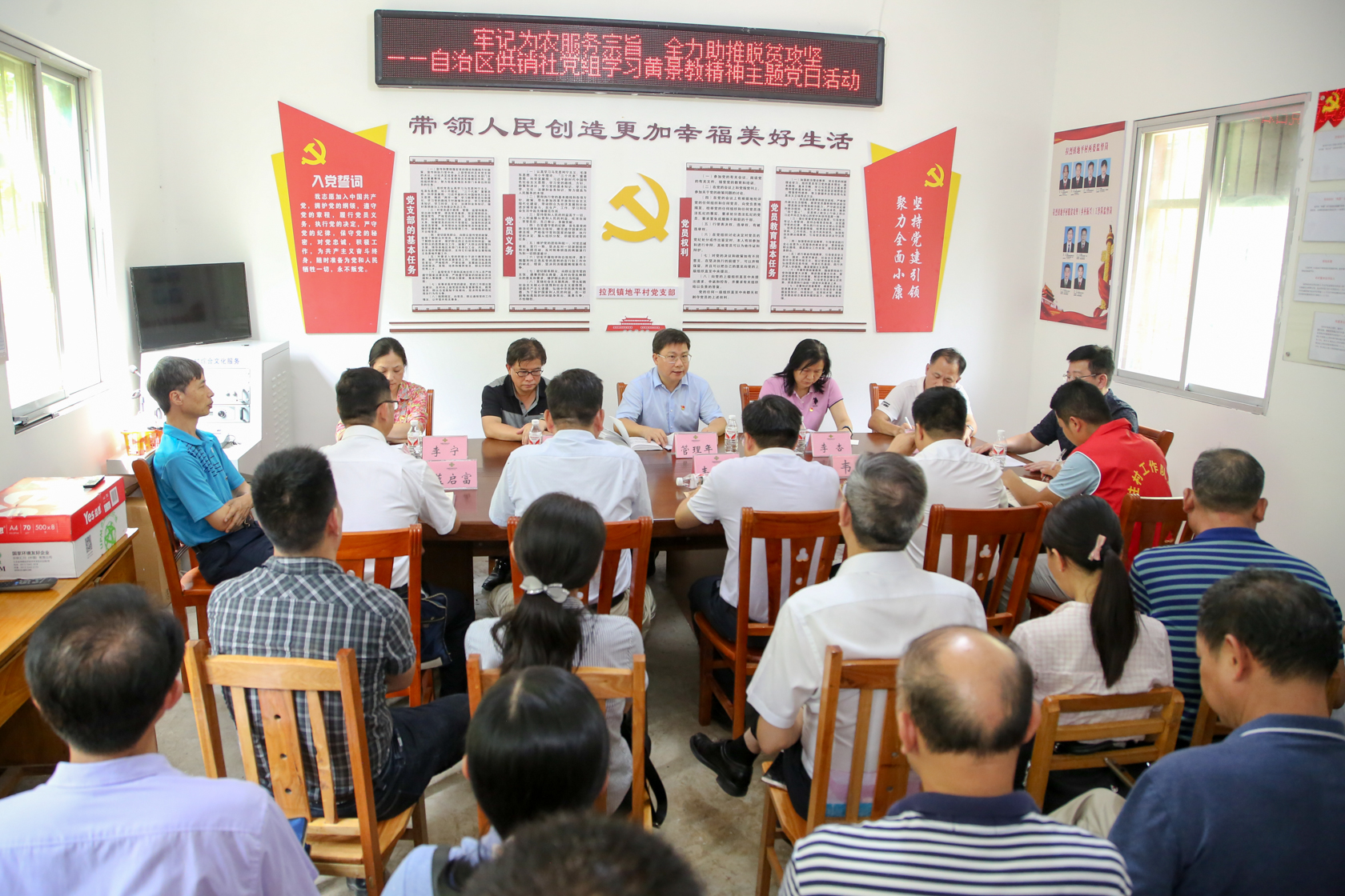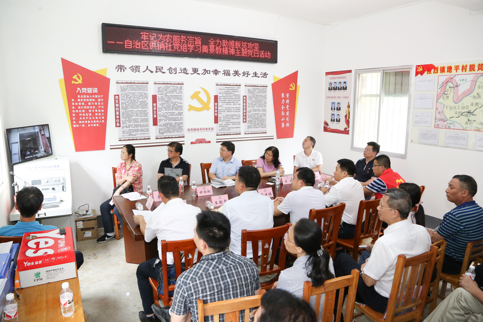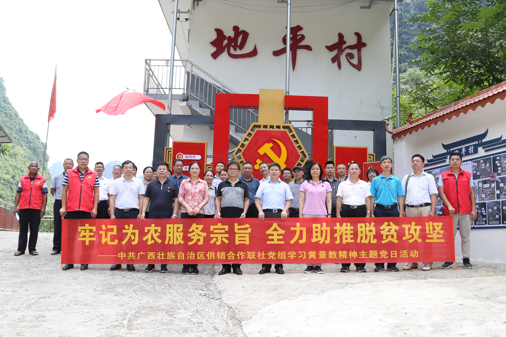 在中国共产党成立99周年之际,为贯彻落实自治区党委关于学习黄景教同志先进事迹的部署要求,进一步弘扬正气、宣传供销社系统先进典型,持续掀起学习黄景教同志先进事迹的热潮,引导广大党员干部职工以黄景教同志为榜样,做到学榜样、守初心、担使命、见行动,将学习黄景教同志先进事迹与推进供销社综合改革、助推乡村振兴和脱贫攻坚结合起来,更好地发挥供销社独特优势和重要作用,7月1日,自治区供销社党组书记、理事会主任管理年带队赴都安县拉烈镇地平村开展“牢记为农服务宗旨,全力助推脱贫攻坚”暨学习黄景教同志先进事迹主题党日活动。