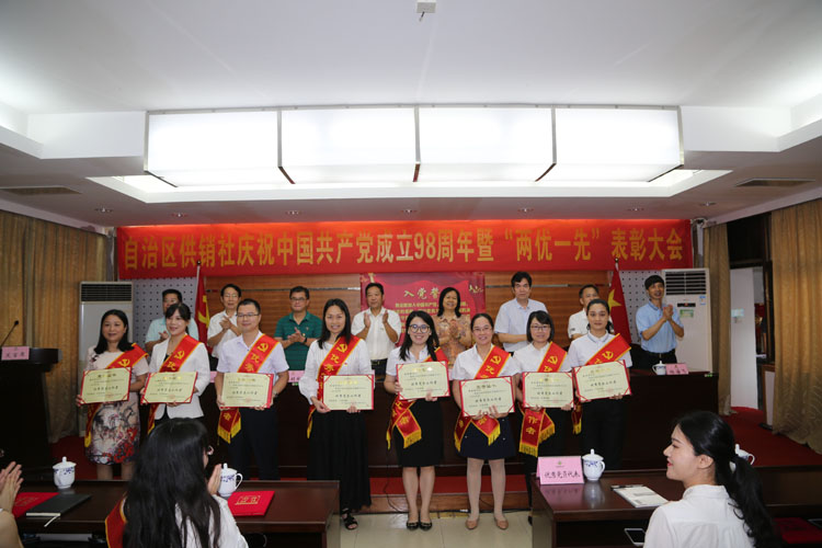 2019年7月1日上午,自治区供销社在二楼会议室召开庆祝中国共产党成立98周年暨“两优一先”表彰大会。会议由党组成员、理事会副主任谭明同志主持,副厅级以上领导、机关及机关服务中心全体党员干部、驻邕各直属企事业单位代表共90多人参加会议。