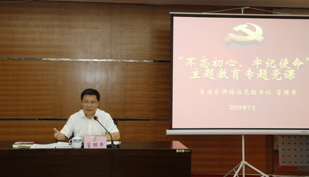 按照自治区党委“不忘初心、牢记使命”主题教育工作部署,管理年以“守初心、持恒心、强信心,加快推进广西供销社综合改革发展取得新突破”为主题,并结合近年来自治区供销社在综合改革、社有企业改革发展、项目建设、脱贫攻坚、党建和党风廉政建设等方面重点工作,引用大量数据和案例,为全体党员干部上了一堂生动详实的党课。