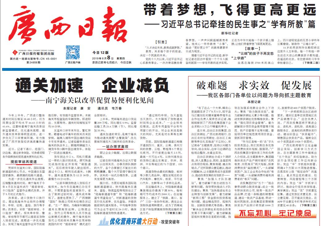 2019年8月8日,《广西日报》在第1版刊登了题为《破难题 求实效 促发展——我区各部门各单位以问题为导向抓主题教育》文章,对区联社扎实推进“不忘初心、牢记使命”主题教育进行了宣传报道。
