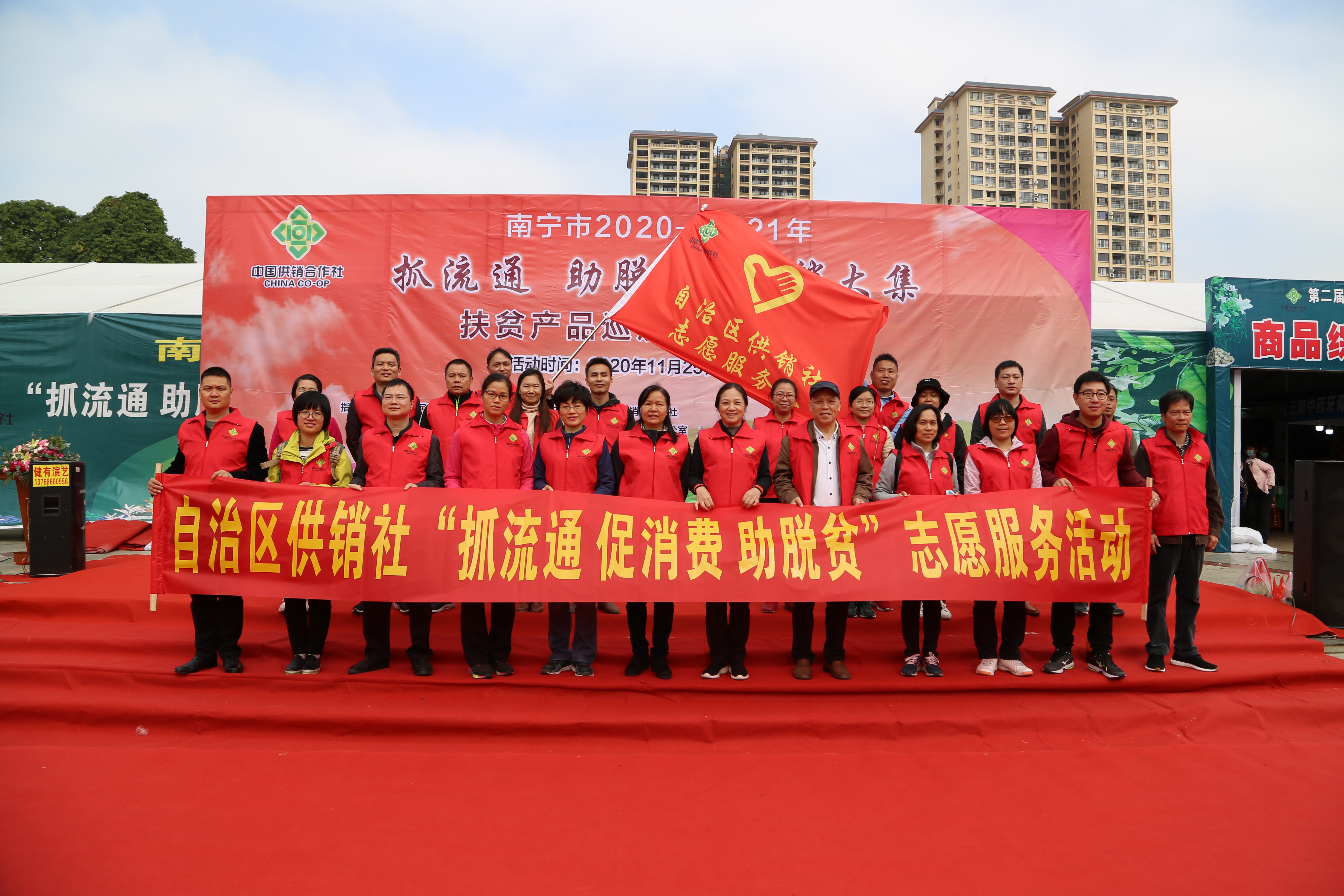 为深入贯彻落实习近平总书记关于“三农”工作和供销合作社工作的重要指示批示精神,进一步宣传好新时期党和国家的“三农”方针政策以及供销合作社的历史地位、职责任务等,结合南宁市供销社2020-2021年“抓流通 助脱贫 供销大集”扶贫产品巡展(横县专场)活动安排,自治区供销社于2020年11月27日组织志愿服务队队员赴横县体育中心广场开展“抓流通 促消费 助脱贫”志愿服务活动。在自治区供销社党组副书记、监事会主任、志愿服务队队长李杏和党组成员、监事会副主任李宁的带领下,志愿服务队队员近30人参加了活动。