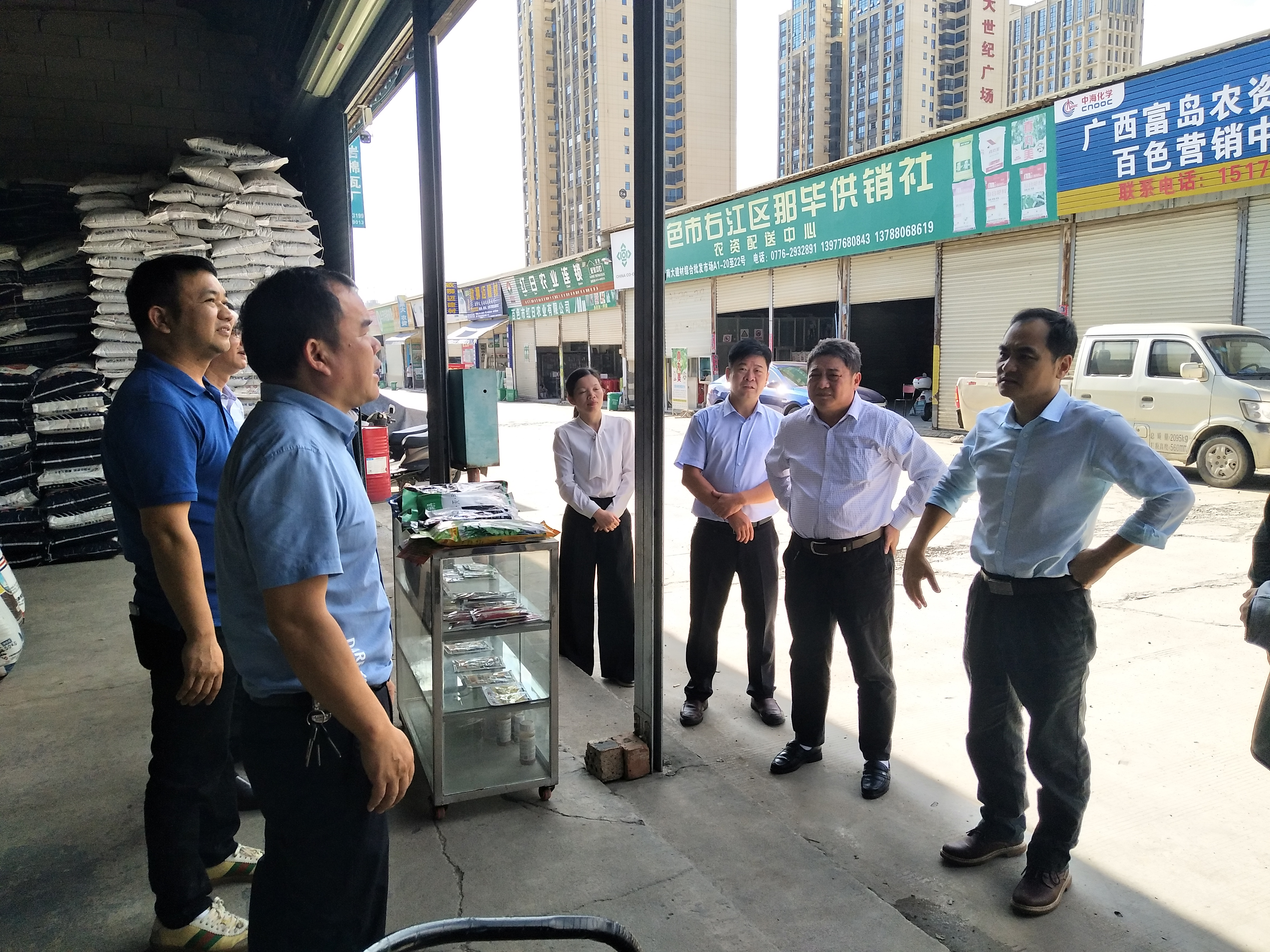 图为:农毅组长(右一)到右江区供销社农业生产资料批发市场调研