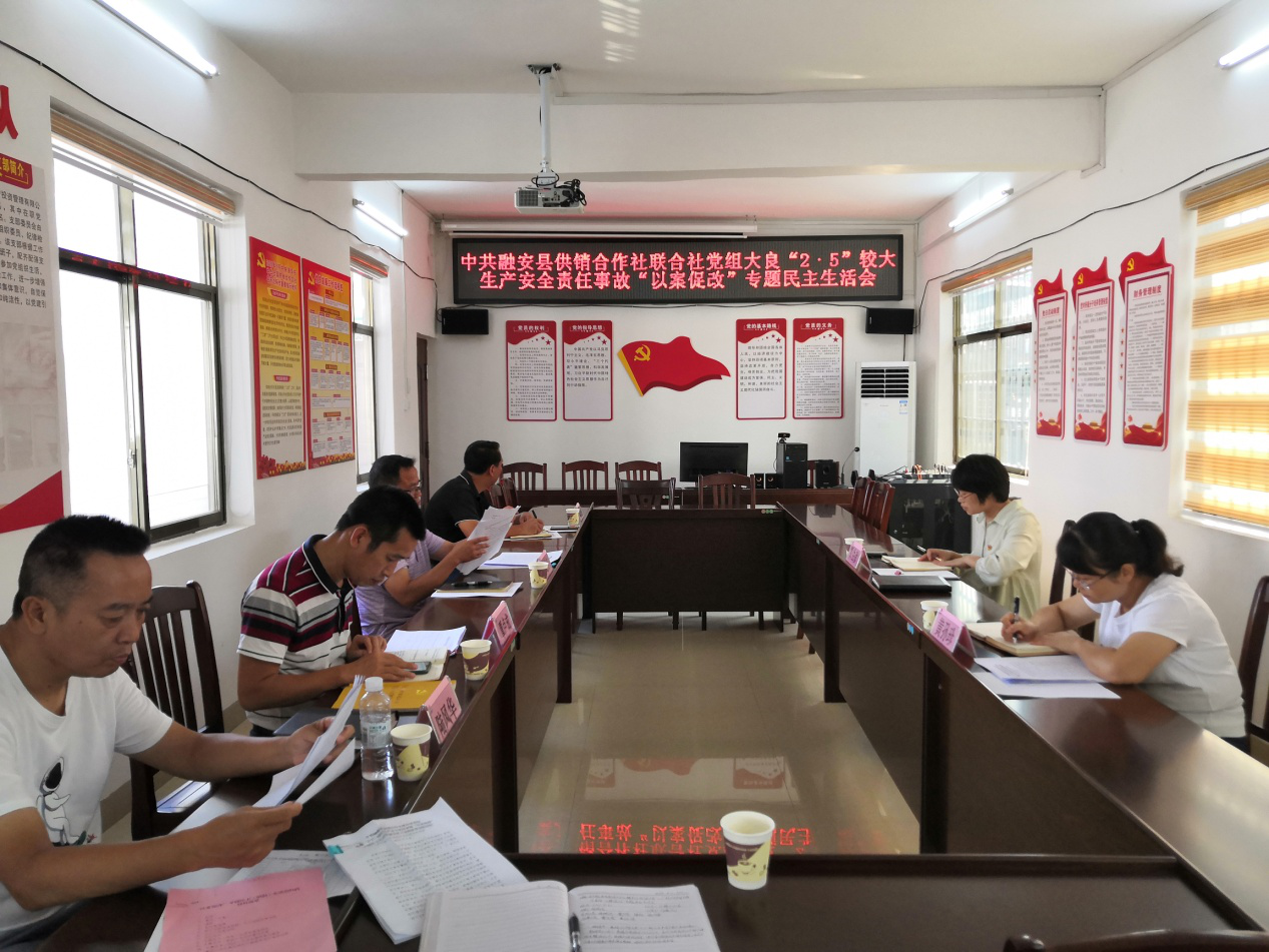 近日,融安县供销社召开大良“2–5”较大生产安全责任事故“以案促改”专题民主生活会。融安县委组织部副部长覃生彦同志、县纪委监委派驻市场监督管理局纪检监察组组长黄孙珍同志到会指导。