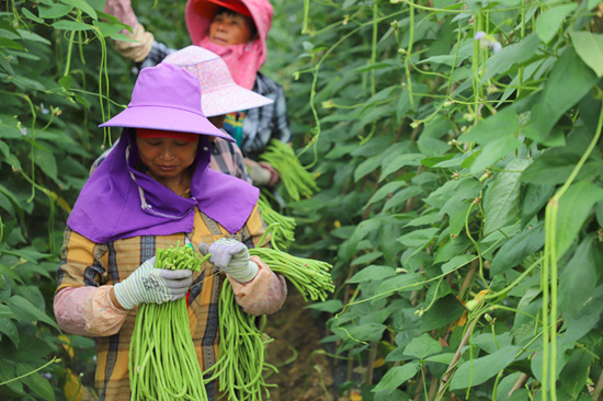 村民们在种植基地里采摘豆角。融水县委宣传部供图