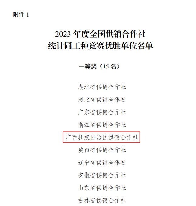 近日,中华全国供销合作总社对2023年度全国供销合作社统计同工种竞赛优胜单位进行通报,自治区供销社荣获2023年度全国供销合作社统计同工种竞赛一等奖,全国排名第5位,取得历史最好成绩。