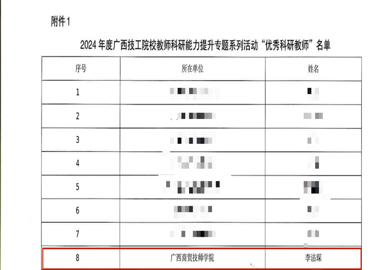 在2024年度广西技工院校教师科研能力提升专题系列活动中,广西商贸技师学院凭借出色的组织工作和卓越的科研表现,荣获“优秀组织单位”称号。李洁琛、陈世辉两位老师凭借在科研领域的突出贡献,荣获“优秀科研教师”称号。