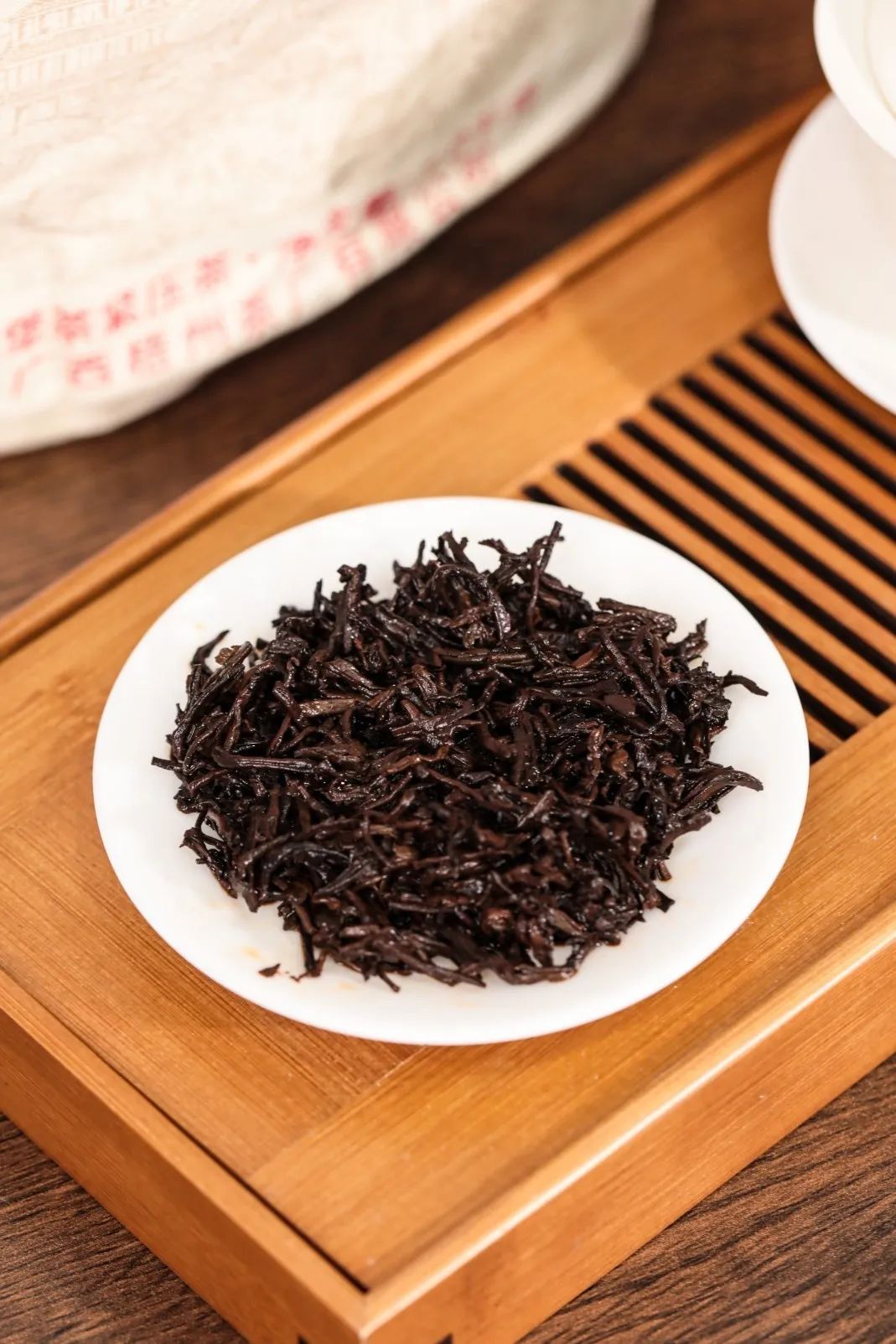 选用特级优质茶料制作,砖面平整,松紧适度,棱角分明;外形色泽黑褐油润,条索紧细匀整,间有嫩梗嫩茎,砖内间有金花;干茶陈香纯正,木质香明显,以及浓郁的槟榔香。