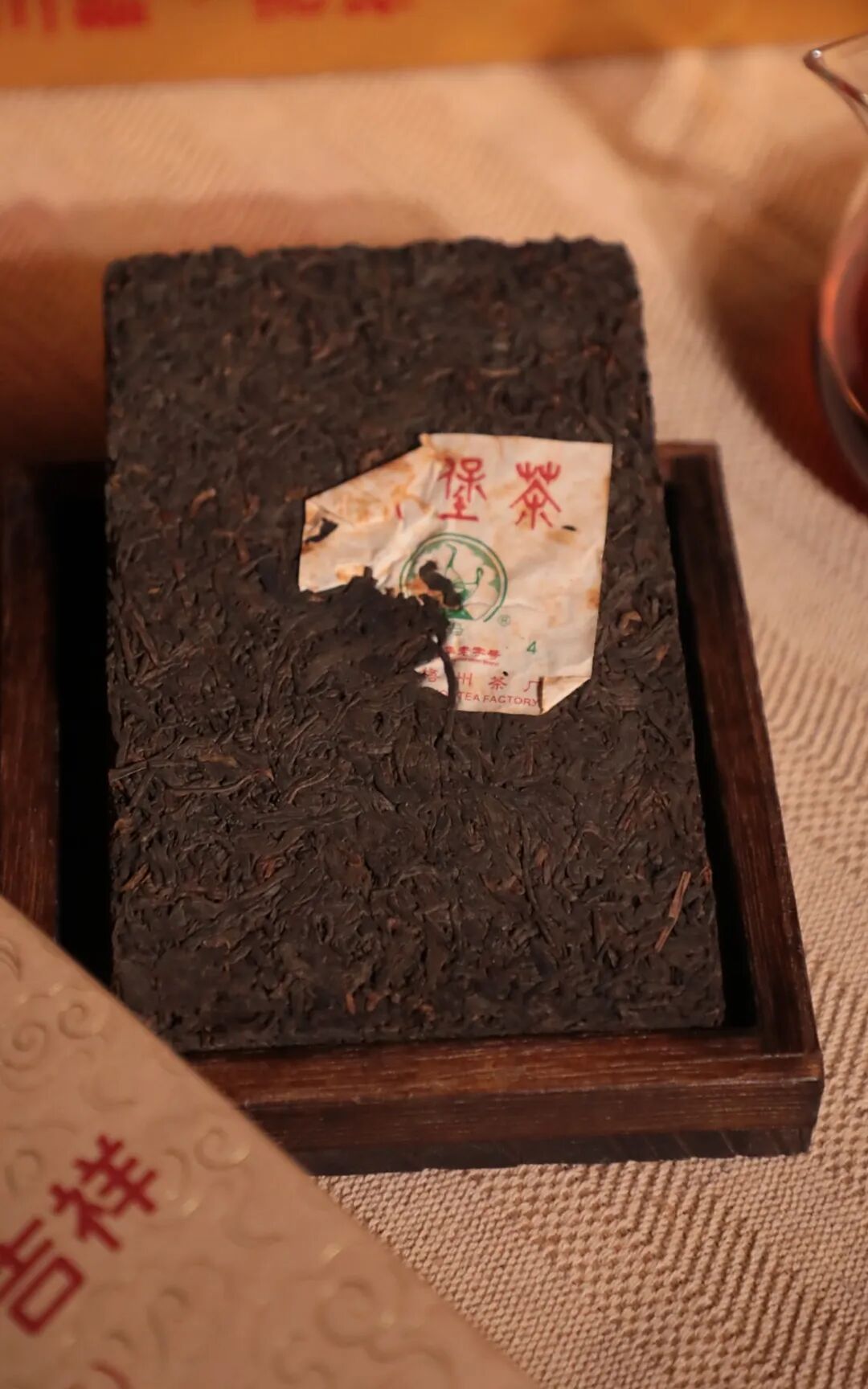 选用特级茶料制作,砖面平整,压制松紧适度,菱角分明,外形色泽黑褐油润,条索紧结匀整,砖内间有金花,细嗅干香纯净。