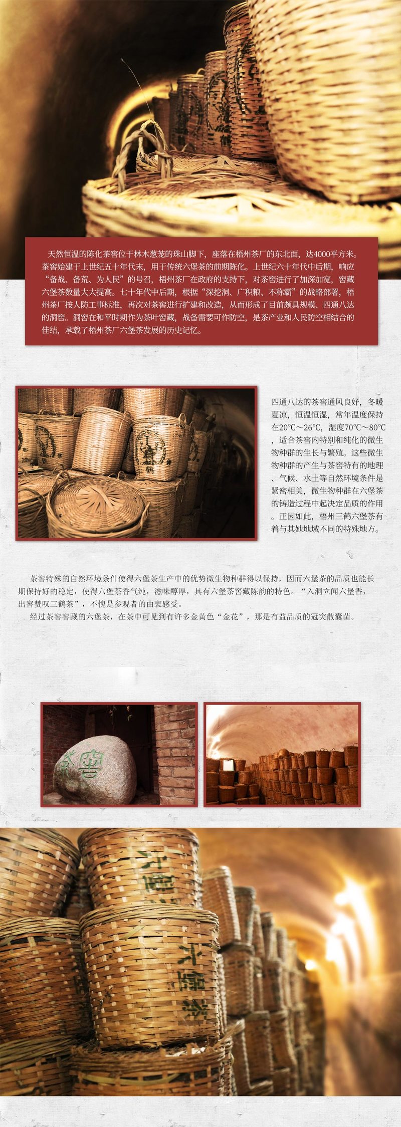 四通八达的茶窖通风良好,冬暖夏凉,恒温恒湿,常年温度保持在20°C~26°C,湿度70°C~80°C,适合茶窖内特别和纯化的微生物种群的生长与繁殖。这些微生物种群的产生与茶窖特有的地理、气候、水士等自然环境条件是紧密相关,微生物种群在六堡茶的铸造过程中起决定品质的作用正因如此,梧州三鹤六堡茶有着与其她地域不同的特殊地方。