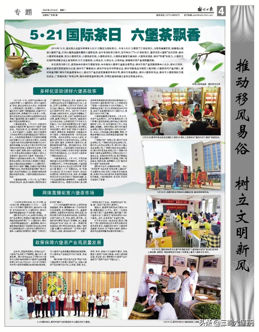 六堡茶进校园。5月21日,位于梧州学院的田径场,食品与制药工程学院举办了“国际茶日”茶会活动,约300人参加,茶学、食品科学与工程专业的学生以及外国留学生分为多个小组,采用“以老带新、以茶为友”的形式,相互交流心得体会。同学们向前来茶席的师生介绍茶叶历史、益处、特点,并邀请品茶论道。食品科学与工程专业的学生专门为本次茶会献上他们自己制作的茶点。这些茶点都融合了六堡茶相关元素,达到了色香味俱全的效果,赢得了师生们一致好评。“能够举办这次茶会活动,让我感受到了中华茶文化的魅力。在与老师近距离的交谈过程中,我对茶学知识有了更深入的了解,洗具、投茶、洗茶、泡茶、分茶、敬茶一整套完整的冲泡过程下来,更是对茶艺技术的考量。”2021级茶学班谭花桂分享了她的感受。5月19日,梧州城的西边,梧州职业学院校园内,梧州“非遗”来助力六堡茶文化普及,狮舞采茶、粤曲颂茶、太极邀你共赏六堡茶、少数民族奉茶等一系列活动正在有序开展。活动共有师生1000余人参加,丰富多彩的传统文化和茶有机结合,让师生学茶、爱茶、懂茶,共同传承六堡茶文化,彰显民族团结新气象。梧州城的东边,市茶产业发展中心、六堡茶国际交流促进会共同在万秀区五坊路小学举行非遗六堡茶制作技艺进校园活动,让小学生对六堡茶有了更加深刻的以识,让小学生从小树立爱茶、种茶的意识,形成良好习惯。
