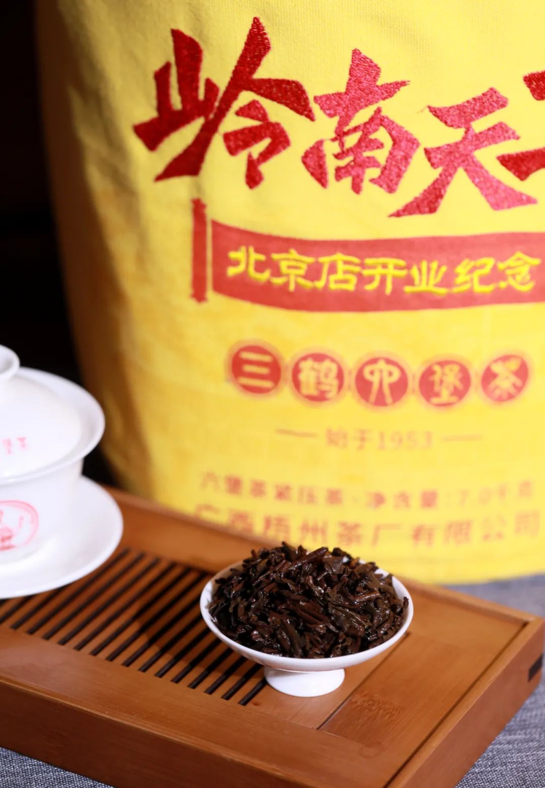 为纪念北京店开业,三鹤特别筹备了一款7千克原箩紧压茶【岭南天工】,采用六堡茶最经典的竹箩加布袋的包装形式,呈现最典型的“三鹤味”,用一杯时光沉淀的醇香,凝聚天工与精心,彰显独特的岭南茶韵。