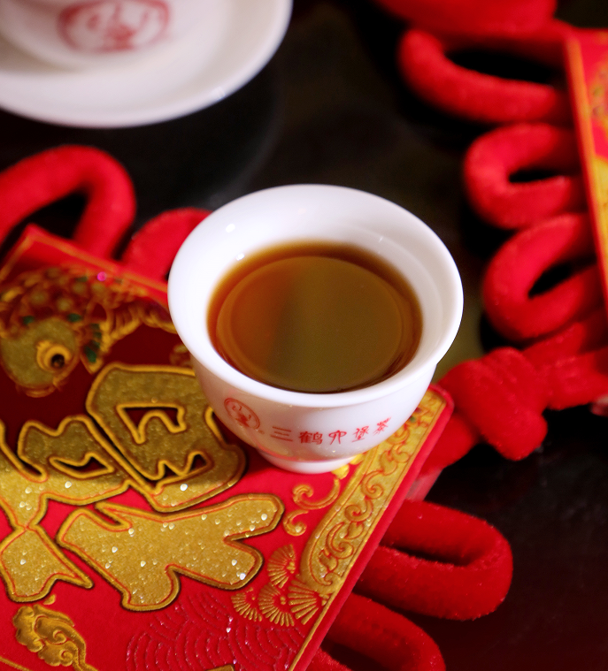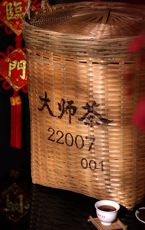 【大师茶22007】为40kg大箩茶,其外形色泽乌褐油润,条索紧而细嫩,间有肥壮且密披茸毛的金毫;干茶陈香优雅,木质香浓郁、窖藏气韵明显。