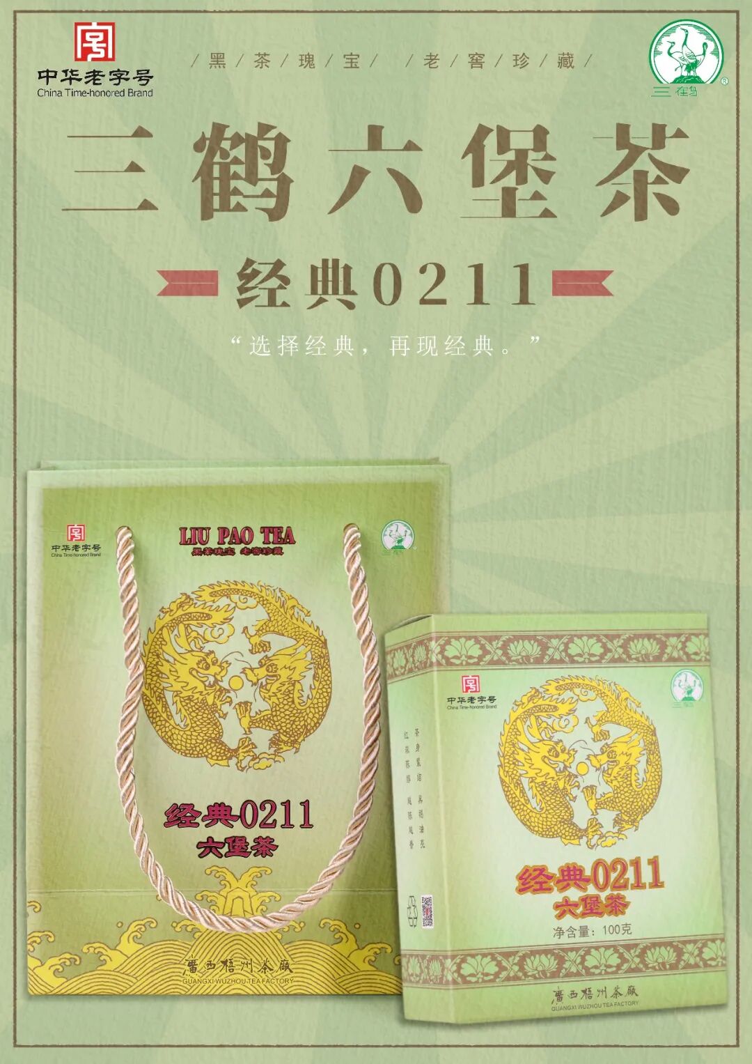 2020年,三鹤六堡茶推出复刻版【经典0211】,选用2017年陈化的特级原料,延续经典配方与传统工艺。