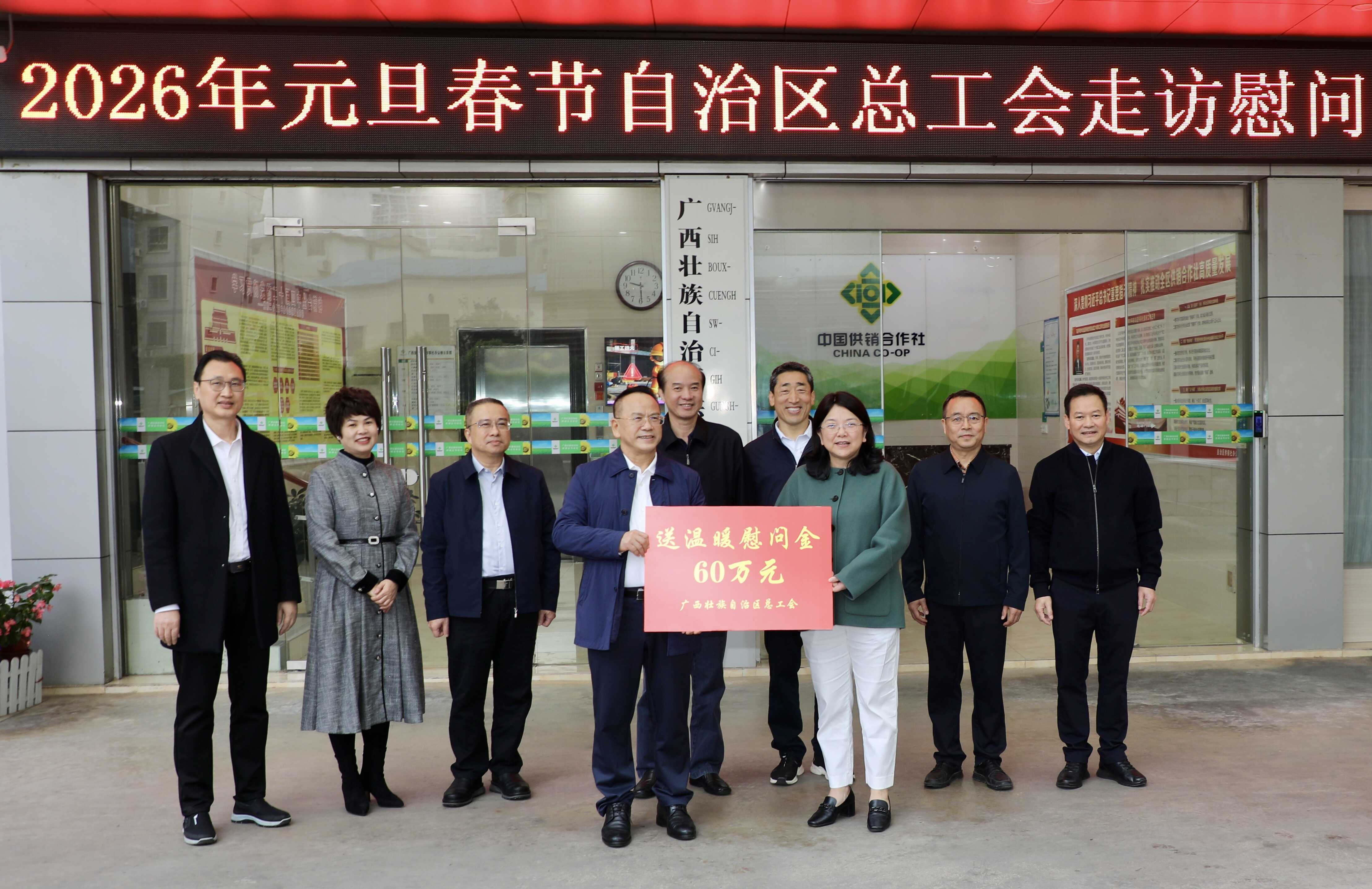 1月19日,自治区人大常委会副主任、党组副书记,总工会主席黄伟京率慰问团到自治区供销社开展2026年元旦春节送温暖走访慰问活动。自治区供销社党组书记、理事会主任陈红,自治区总工会党组书记、常务副主席韦永山,自治区供销社党组副书记、监事会主任刘宗晓,自治区总工会党组成员、副主席韦克轩、黄韬,自治区供销社党组成员、监事会副主任蒋名斌,自治区供销社党组成员、理事会副主任蒋春华参加慰问活动。