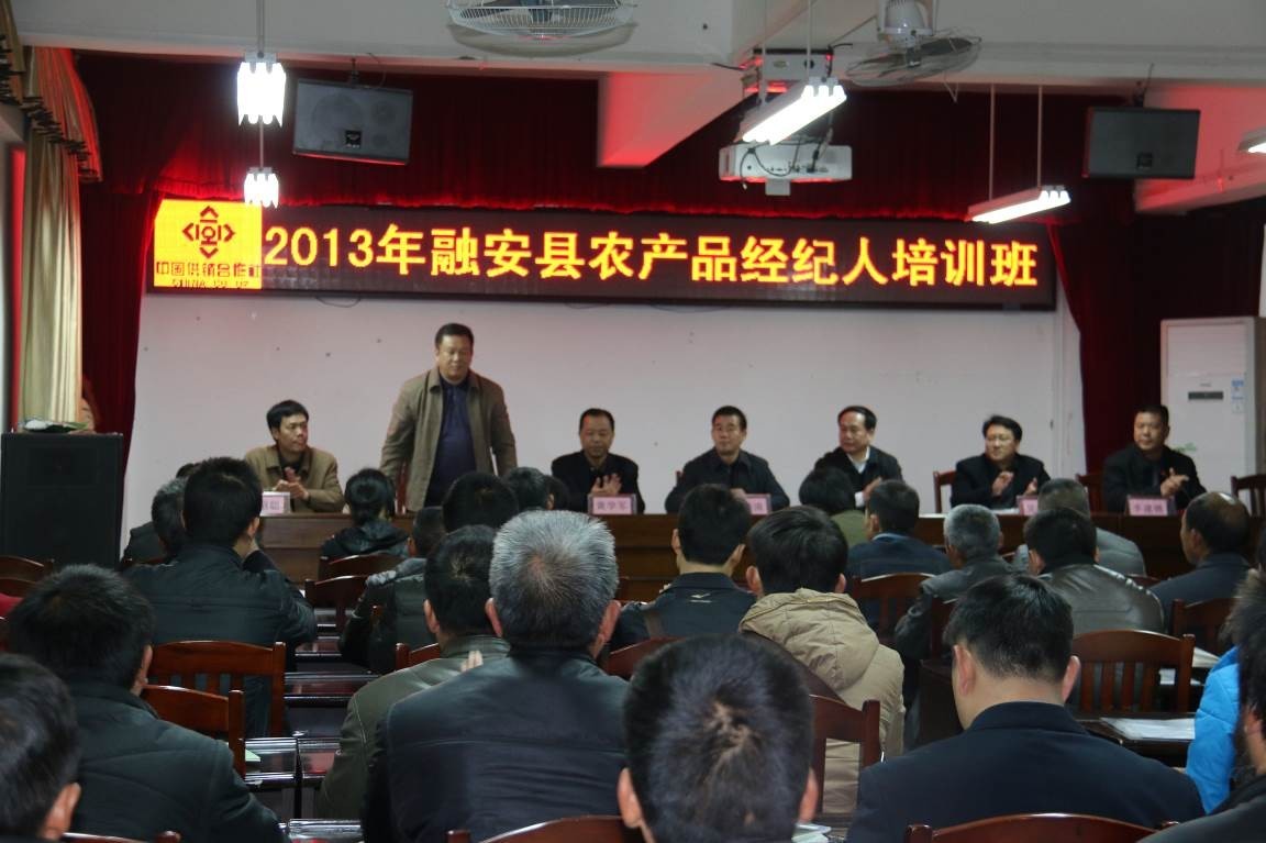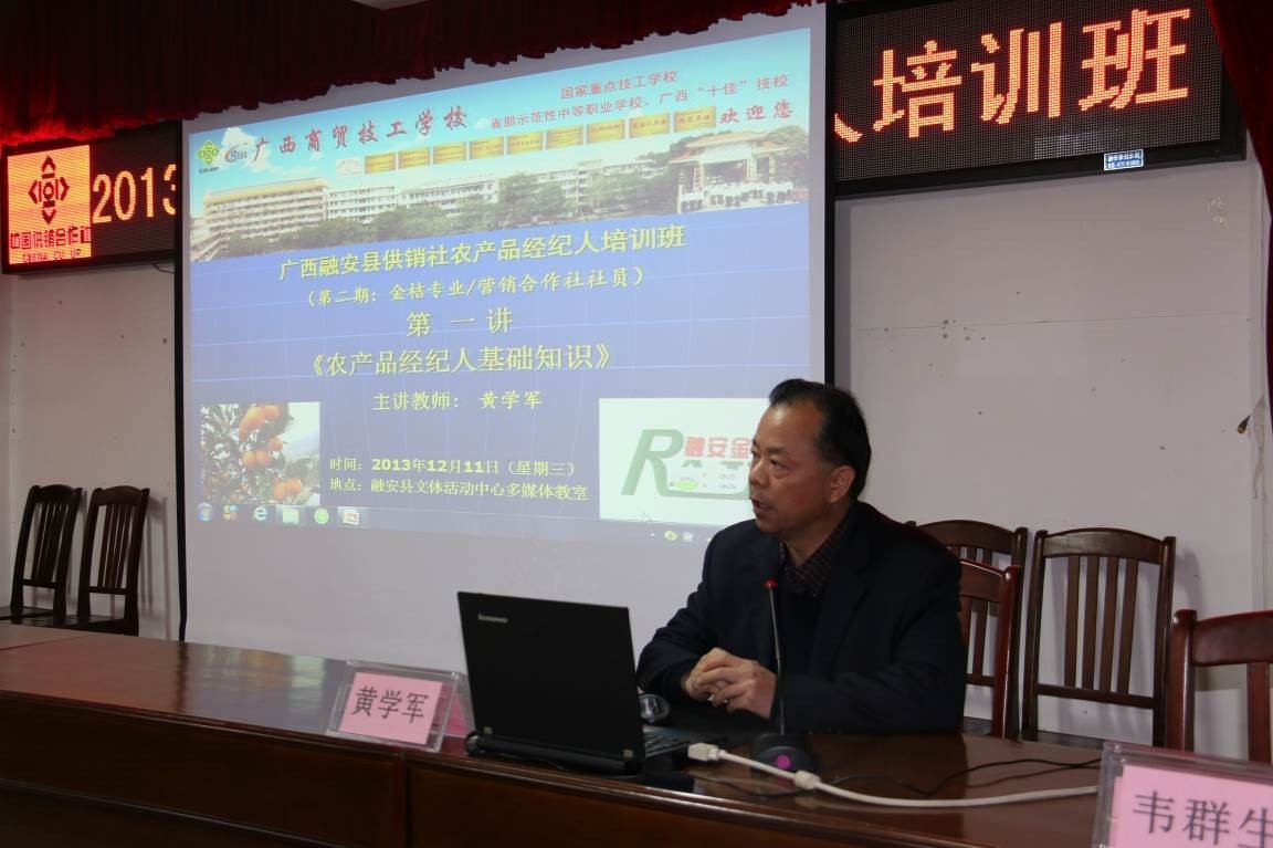 广西商贸技工学校在2012年11月成功为融安县供销社举办的第一期融安县农产品经纪人培训班(89人)提供职业技能培训与鉴定服务的基础上,今年12月11~13日,又应融安县供销社的盛情之邀,组织学校农产品经纪人教学团队再次到融安县为全县90位金桔、土鸡、食用菌、杂粮等农产品专业合作社理事长、理事和种养、营销大户进行职业技能培训和鉴定,并实地到融安县肖销竹叶有限责任公司、融安织金商贸有限公司、融安县裕锦源农产品专业合作社、融珍土特产店进行考察和指导,受到供销社和学员的热烈欢迎。