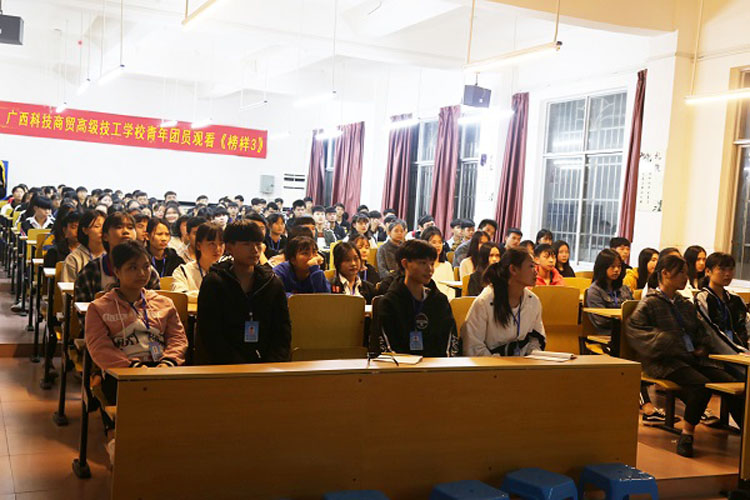 为加强学生的思想政治意识,用榜样的力量引领学生成人成才,近日,广西科技商贸高级技工学校组织140余名青年团员及学生代表在柳江校区一楼多媒体教室观看专题节目《榜样3》,激励学生学习榜样,争做榜样,苦练技能,报效祖国。