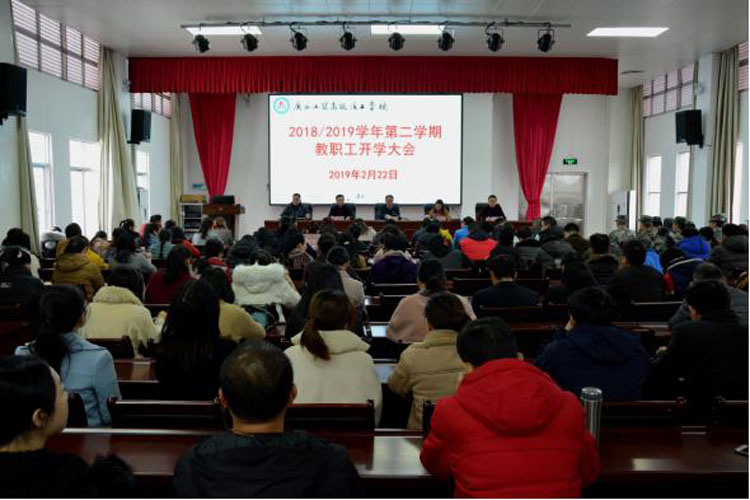 2月22日上午,广西工贸高级技工学校在七楼会议室召开2018/2019学年第二学期教职工开学大会,部署新学期的重点工作。校领导班子和全体教职工、驻校教官、驻校物业代表等共计200多人参加了会议,会议由校长助理覃尚才主持。
