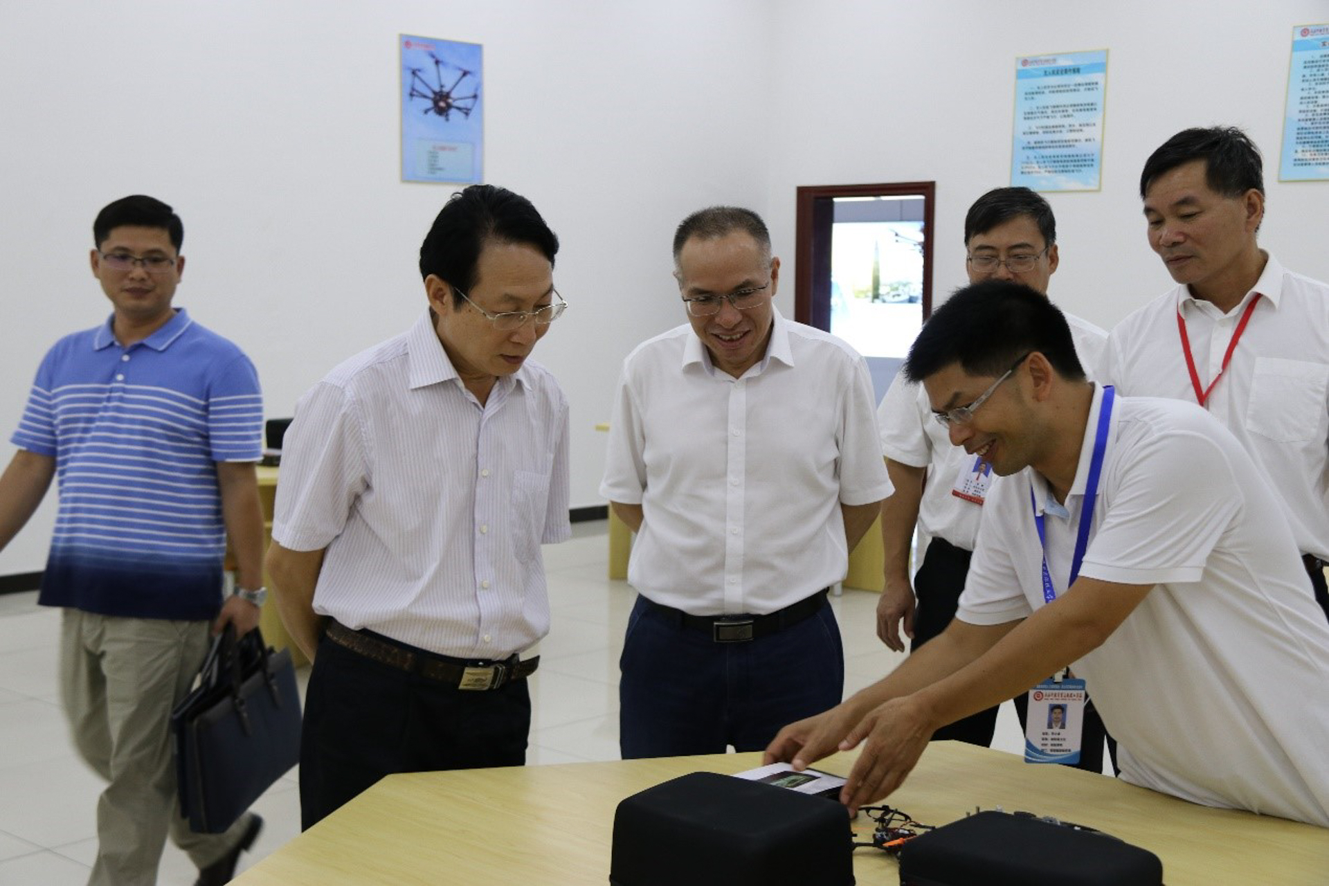 图为:陆远万在广西钦州商贸学校与学校领导、老师们座谈。