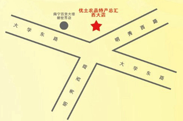 广西特产网优土农品特产总汇西大店地址:南宁市西乡塘区明秀西路118号(明秀西路与大学路交汇处百汇华庭副楼,南职院隔壁)