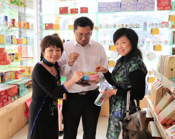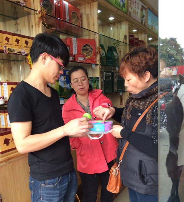 14 广西特产网董事长黄光强(中)、广西特产网何彩云总监(左)、广西源安堂肉桂产业有限公司姜总(右)在现场品尝新品。