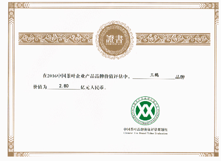 近日,浙江大学CARD中国农业品牌研究中心、中国茶叶品牌价值评估课题组发布了《2016中国茶叶企业产品品牌价值评估报告》,广西壮族自治区梧州茶厂“三鹤”品牌价值为2.80亿元人民币,位列2016中国茶叶企业产品品牌价值排行榜第40位,继续稳居广西茶叶企业产品品牌首位。