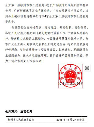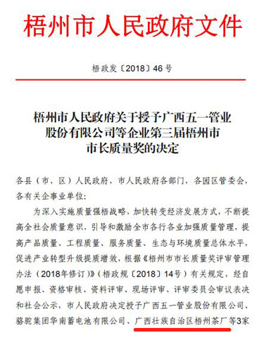 近日,梧州市人民政府发布《关于授予广西五一管业股份有限公司等企业第三届梧州市市长质量奖的决定》,广西梧州茶厂榜上有名,荣获第三届梧州市市长质量奖。这是梧州茶厂继2016年获得第二届梧州市市长质量奖提名奖以来的更上层楼,彰显了“中华老字号”六堡茶龙头企业的风范。