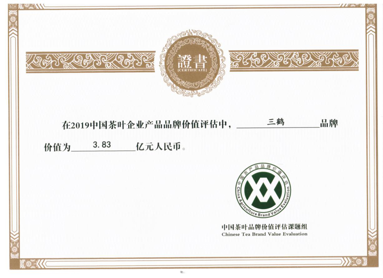 近日,中国茶叶品牌价值评估课题组发布了《2019中国茶叶企业产品品牌价值评估报告》,广西壮族自治区供销合作联社直属企业梧州茶厂的“三鹤”品牌价值为3.83亿元人民币,位居中国茶叶企业产品品牌前100位的第32位、广西茶叶企业产品品牌首位。