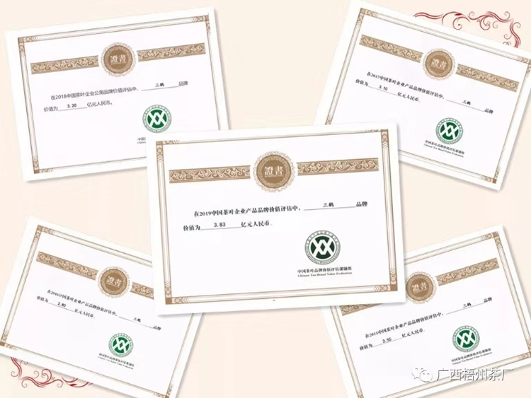 梧州茶厂“三鹤”品牌价值2015年为2.55亿元,2016年为2.8亿元,2017年为3.1亿元,2018年为3.2亿元,2019年为3.83亿元。五年间,“三鹤”的品牌价值提升了1.28亿元,整体涨幅达到50.2%,这是梧州茶厂文化传薪火、实干闯未来的价值体现。
