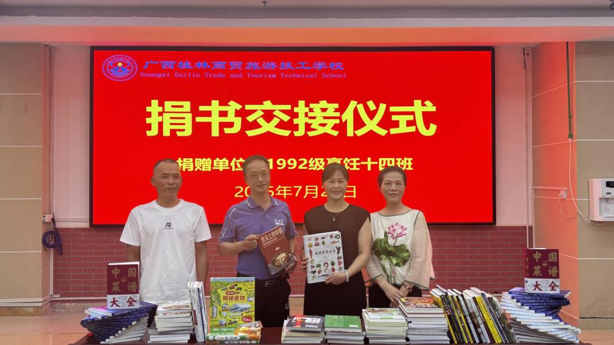 七月的桂林,骄阳似火,却不及广西桂林商贸旅游技工学校里涌动的温情。2025年7月26日下午,阔别母校30年的1995届烹饪14班的校友们,回到熟悉的母校——广西桂林商贸旅游技工学校,一场饱含深情的聚会与捐书交接仪式,在此温馨上演。学校党总支书记、校长朗宏芳出席,党总支副书记、副校长高兵兵主持活动,为这场跨越三十年的重逢增添了别样的庄重与暖意。